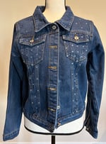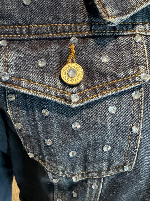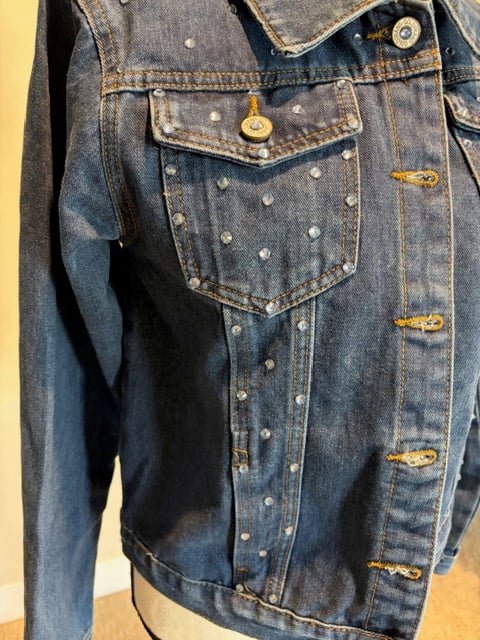 This blue jean jacket is adorned with 130 blue glass rhinestones. Each button has a blue rhinestone in the middle, and the back of the jacket is also adorned with rhinestones. It's the perfect combination to be noticed in a crowd, A video of the product is available upon request.