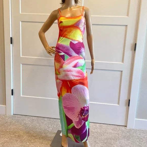 Multi colors of orange, pink, yellow, and green maxi dress. Material is 95% polyester and 5% spandex. Fabric is stretchable.