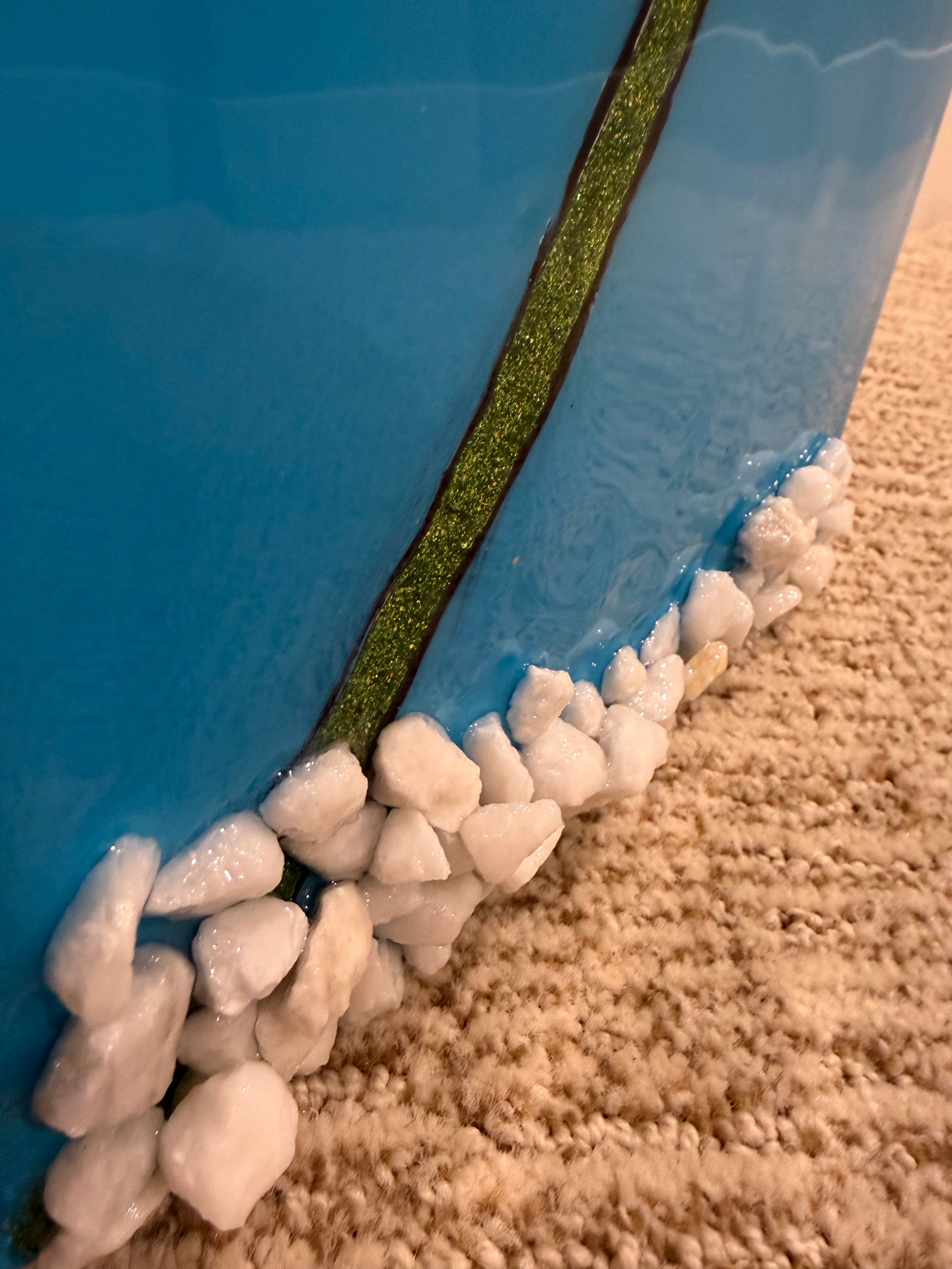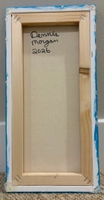 This canvas was painted with a blue background for a spring feel. The flower, stems and leaves are painted, and glitter is added for a little sparkle. The bottom of the canvas is adorned with white rocks that have a 3D look. The entire canvas is sealed in resin so no glitter will come off. I had an error on this one if you look at the second picture. The paint on one of the leaves smeared during the resin process. I decided to drop this $5 for the error.