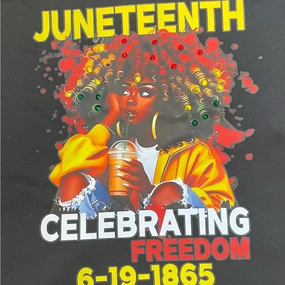 Black t-shirt featuring a vibrant Juneteenth design. Bold colors and striking graphics. This T-shirt has a total f 23 multicolored rhinestones. The rhinestones are in the model's hair, illuminating one of her great features. This shirt is made of 95% polyester and 5% elastase. For best results hand wash or wash on delicate cycle. Air dry only, no machine dry.