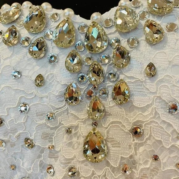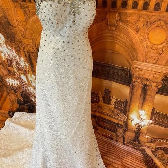 Sweetheart neckline wedding dress adorned with full body lace and rhinestones. Dress is lined with a soft satin lining for comfort. The sweetheart neckline is adorned with glass rhinestones for that beautiful diamond look. Stones are made of glass, not acrylic. This dress is a size 18 that can be altered to fit by your favorite tailor. The dress has a back drawstring for that perfect fit.